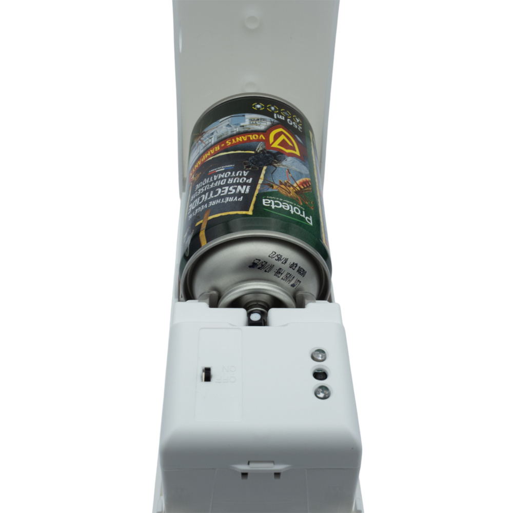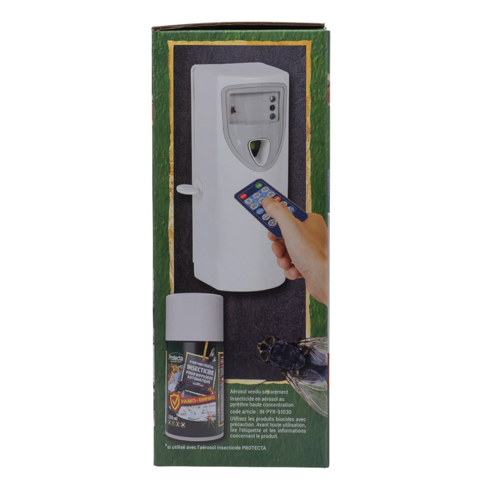 Le diffuseur automatique Protecta permet une diffusion contrôlée d’insecticide à base de pyrèthre végétal, une substance d’origine naturelle reconnue pour son efficacité contre les insectes volants. Grâce à sa programmation automatique, il assure une protection continue, idéale pour les espaces à usage régulier.
