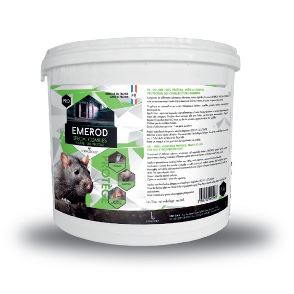 Composée de différentes substances odorantes, toutes végétales, la poudre EMEROD SPÉCIAL COMBLES crée un environnement hostile à la présence de fouines, martres, et autres rongeurs (rats, souris).