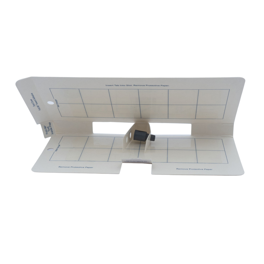 Plier le piège en appuyant fortement en suivant les pointillés. Retirer le film protecteur de l’intérieur du piège. Retirer une capsule à phéromone de son emballage et la placer dans une encoche circulaire sur la partie centrale du piège (voir photo ci-dessus). Rabattre ensuite les deux languettes centrales vers l’intérieur du piège. Fermer le piège en prenant soin de bien rabattre la languette latérale anti-poussière.Enfin, insérer dans l’encoche prévue à cet effet la languette sur laquelle il est mentionné "Insert tab into slot on bottom side".