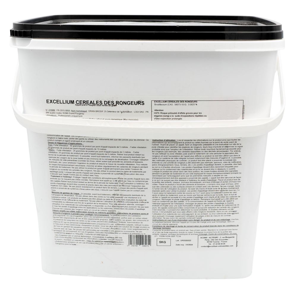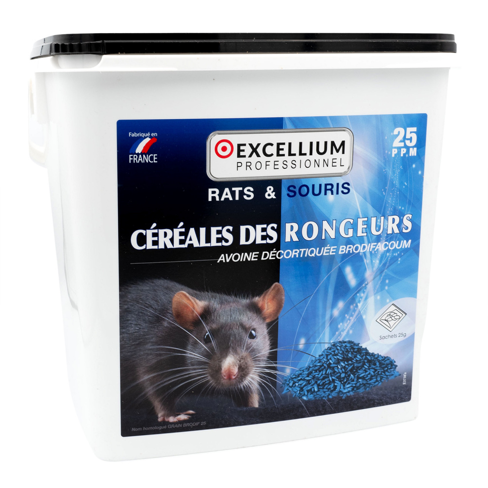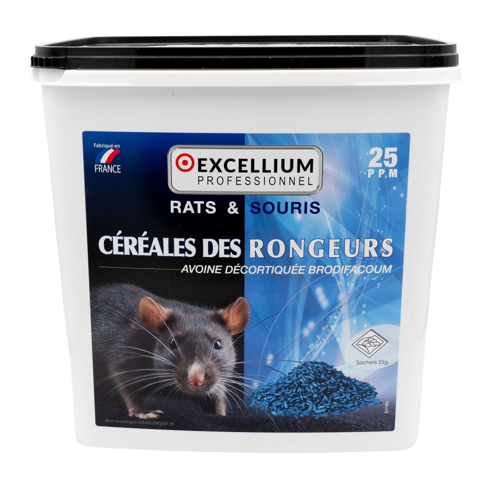 L'appât céréales des rongeurs Excellium est proposé dans un conditionnement de 5kg. Cet appât anti rats et souris à été spécialement conçu pour être utilisé dans des lieux secs tels que des bureaux, entrepôts, maisons, appartements....