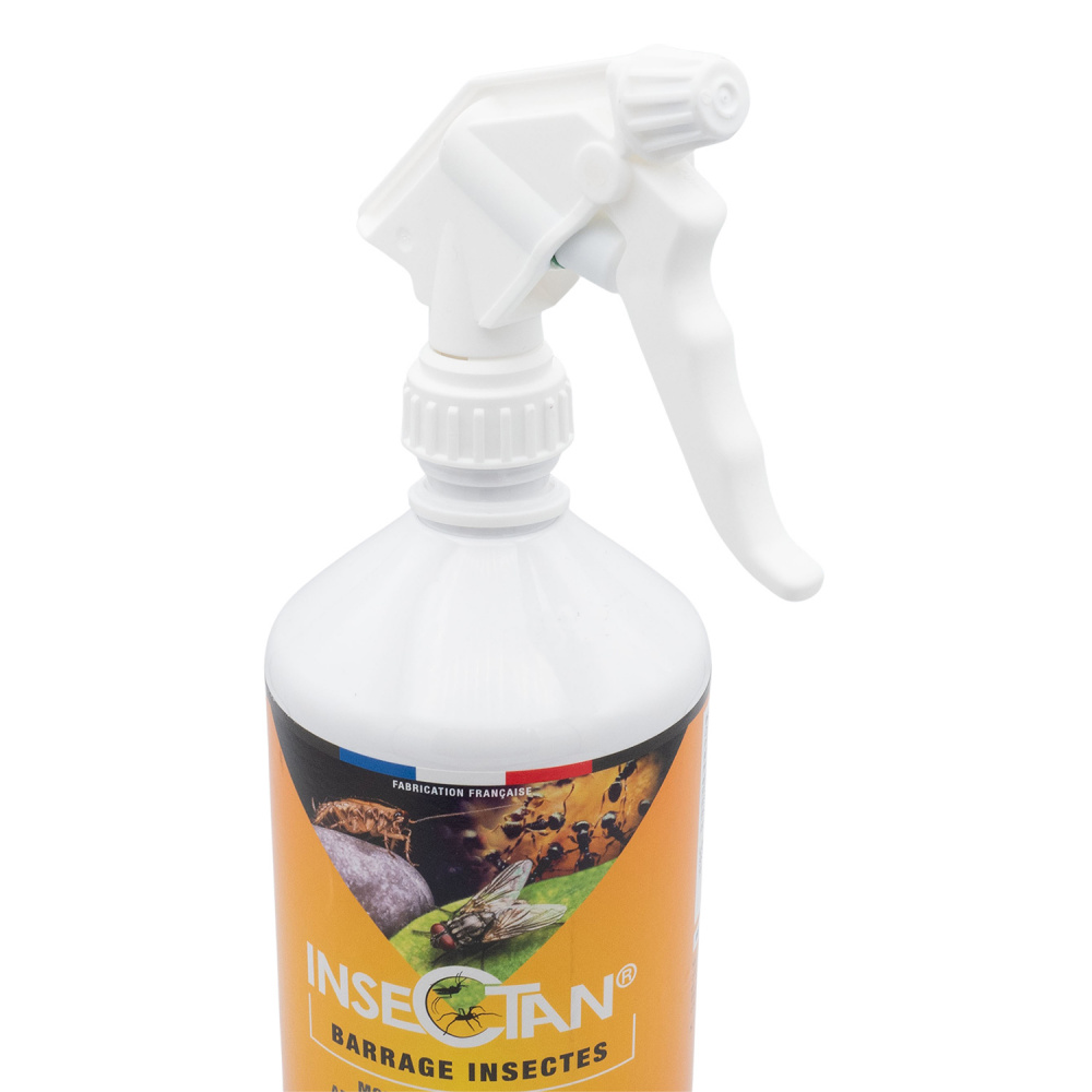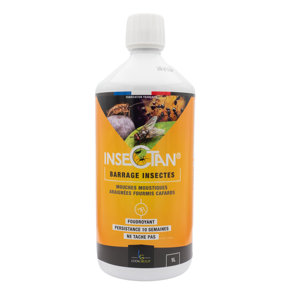 Insectan barrage insectes est un liquide prêt à l'emploi, destiné au traitement des surfaces contre les insectes volants (mouches, moucherons, moustiques, guêpes, frelons, mites, ...) et les insectes rampants (cafards, fourmis, punaises de lit, puces, araignées...).