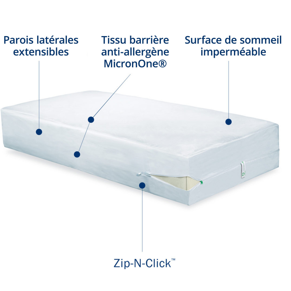 Housse de protection pour matelas et oreillers. Épouse parfaitement la forme de la literie pour garantir une protection hermétique contre les punaises de lit, les acariens, les allergènes et les microtoxines. Confortable, indéchirable et super extensible.
